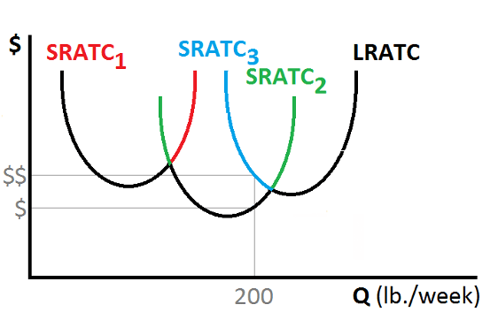 At this point, it is also important to note that Gus could have chosen any production capacity/lab size but the constraints under which he operates pushed him towards the medium-sized lab. He may, nevertheless, revisit this decision and plan differently if the constraints change. However, this is possible only in the long run – after all, “Quite a lot of planning went into this.” Thus, the bottom of all possible short-run average total cost curves outline the long-run average total cost curve (i.e., planning curve).