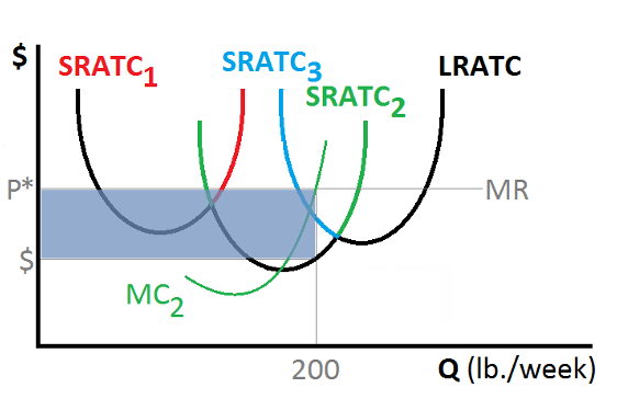 After showing the graphs above, ask students why the short-run average total costs are higher with the small and large laboratories? At this point students should be able to quickly identify that an array of factors, ranging from the need of starting the production process multiple times (if the lab is small) to the risk of being discovered by the Drug Enforcement Agency (if the lab is large), dictate how small or large costs are.